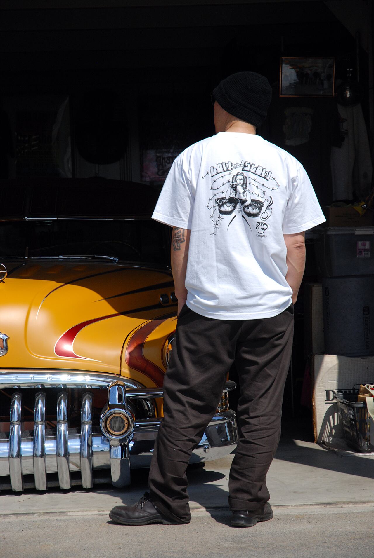 Low&Slow/チョラ/サングラス/カーリーQなどのアイコンは、三者が共通するカルチャー、ローライダー/カスタム/アート/チカーノ/カリフォルニアを表現したデザインが盛り込まれています。