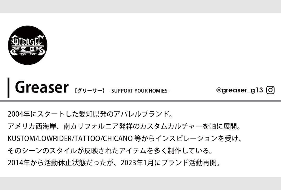 70年代~80年代頃のチカーノスタイルのカークラブやクルーなどの仲間で着るチームジャケットやウェアのロゴに使用されていたフォントを、様々な資料と長年の研究の末、Greaserオリジナルで独自のオールドイングリッシュフォントを一から制作しました。