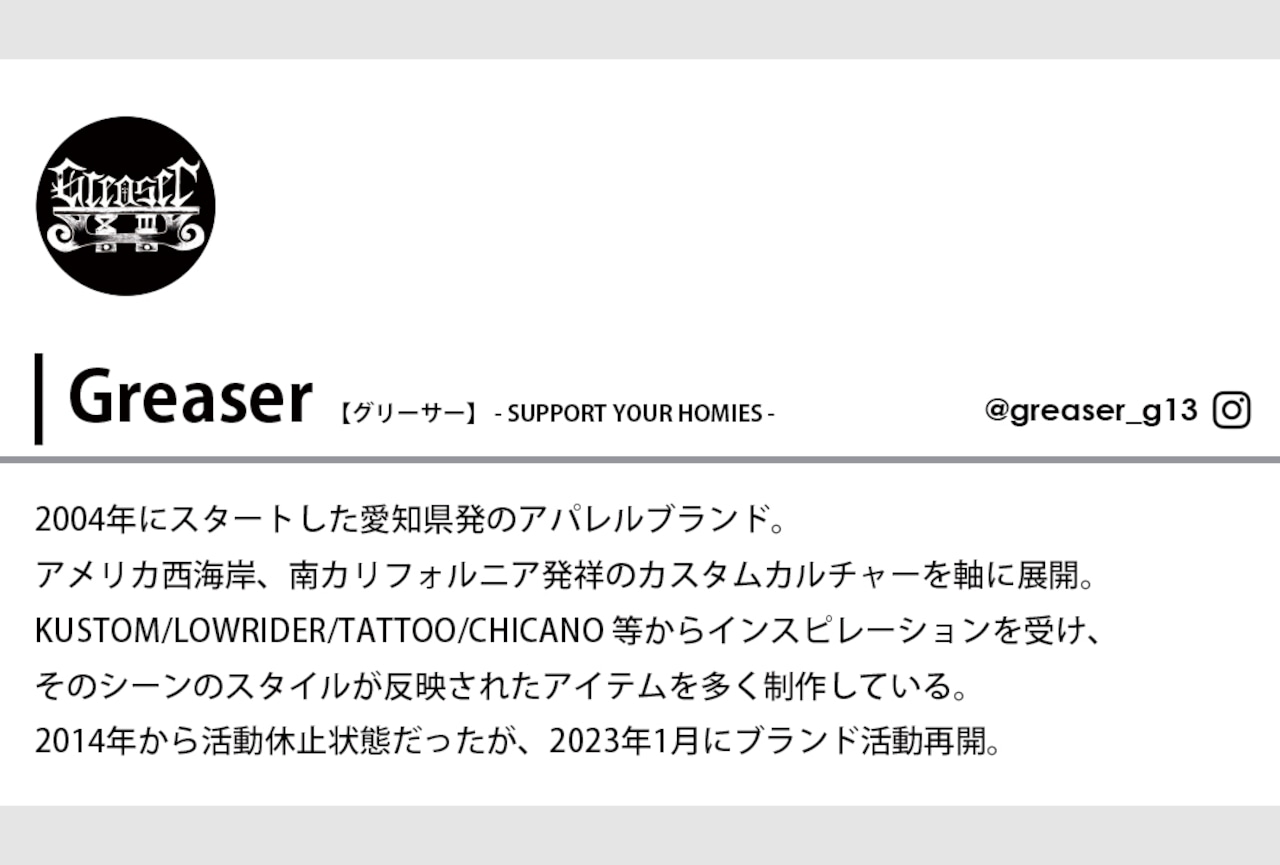 70年代~80年代頃のチカーノスタイルのカークラブやクルーなどの仲間で着るチームジャケットやウェアのロゴに使用されていたフォントを、様々な資料と長年の研究の末、Greaserオリジナルで独自のオールドイングリッシュフォントを一から制作しました。