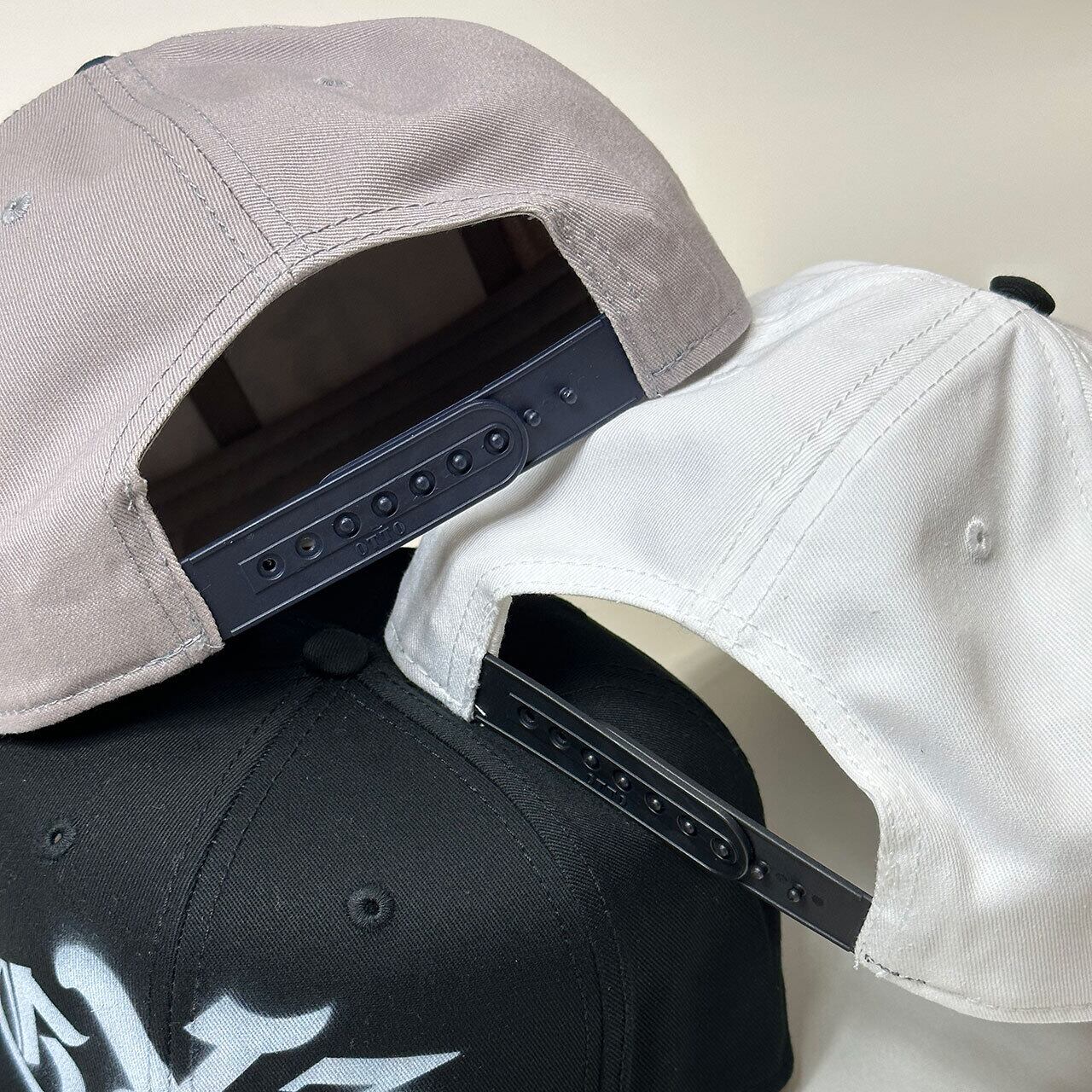 定番のフラットバイザー、スナップバックでサイズ調整可能のコットン100%ボディ。
