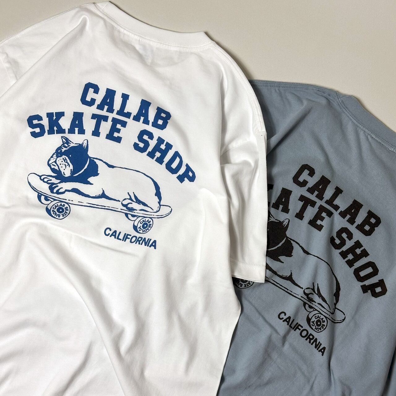 今回は、カリフォルニアにある架空のローカルスケートショップのオフィシャルTシャツ。看板犬のフレンチブルドッグがスケボーに乗っています。